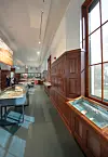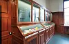 All overflatebehandling, også av de fredede utstillingsmontrene, skapene, og treinnredningen er utført etter antikvariske prinsipper.