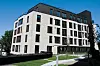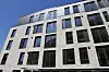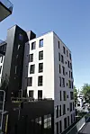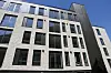 Hun opplyser videre om at øverste etasje på begge bygg er trukket inn for å dempe høyden mot bakken og gi spenst i fasaden.