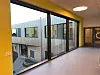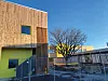 Fra kontoret sitt har prosjektlederen god utsikt til prosjektet. Mens det overleverte skolebygget innredes undervises elevene fortsatt i et paviljongbygg, oppført av kommunen.