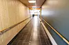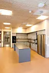 – Øverhagaen bo-, helse- og velferdssenter er blitt et signalbygg. Alt over bakkenivå er i massivtre, kledd med treverk, sier Mads Tamnes. Massivtreet er godt synlig inne i bygget, med søyler og massivtre-overflater på vegger i rommene. Skilleveggene har robuste gipsplater som er malte, det samme gjelder vegger for brannsikring. I mange av de store rommene og gangene er det brukt trespiler på veggene og i himlingen.