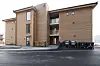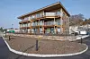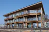 Bygget er rektangulært med et utbygg på baksiden som rommer trappe- og heishus.