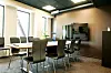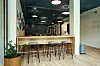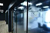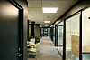 I kontordelen er det mye bruk av teppeflis på gulv, i kombinasjon med sparklet og malt gips på vegger og systemhimling.