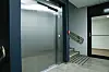 Trapperommet er bygget i plasstøpt betong. Her er veggene malt betong. Gulvene i trapperommet har store fliser. En fin detalj i trappeoppgangene er rekkverkene i eik, produsert av Brødrene Midthaug.