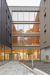 Hun sier fasadene er gitt et vennlig uttrykk, ved bruk av en metallkledning med en profilering som skaper spenning og struktur. Vedlikeholdsbehovet skal være lavt. For å fremheve at dette er et massivtrehus er det valgt å ha partier med trekledning i fasaden. Det benyttes også elementer av tre i tilknytning til utvendige himlinger og ved inngangspartier. Profileringen i fasaden og variasjonen i vindusplasseringen skal gi bygningsmassen et lett og lekent preg.
