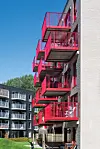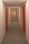 Innvendig så har alle femten etasjer, fordelt på tre bygninger, fått inngangsdører til leiligheter malt med ulike farger fra fargepaletter fra tre ulike Wes Anderson filmer.