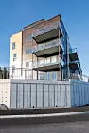 På østsiden av byggene er det tre nedkast for søppel til Molok Classic containere på 5.000 liter for restavfall, 5.000 liter for papir, papp og drikkekartonger og 3.000 liter for mat- og bioavfall.