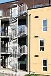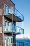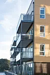 – Det er arbeidet med ulik dybde på fasadekledningen for å oppnå et relieff, der partier med lys kledning fremstår som utkragninger i forhold til en bakenforliggende bygningskropp med mørkere kledning. Sammen med variasjon i utvendig farge på vinduer og balkongdører bryter dette bebyggelsen ned i mindre enheter, og skaper en variasjon som bringer ned skalaen på bebyggelsen. Prosjektets fasader ble i utgangspunktet utformet med stående trekledning i to farger. Med bakgrunn i bortfall av brannteknisk godkjenning av den planlagte kledningen ble dette i utførelsesfasen endret til platekledning med en tilsvarende fargebruk. Variasjonen i farger er forsterket ved tilsvarende utvendig fargevariasjon på vinduer og balkongdører. Det er montert frittstående stålbalkonger med rekkverk av glass innsatt i profiler, sier Mandrup.