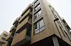 Ut mot gaten er det brann-impregnert, stående thermopanel. Inn mot gårdsplassen er det pussfasade, og ved de tre inngangspartiene er det høyglansplater i aluminium både på vegg og i himling. Mot den ene nabotomta er det prefabrikkerte betongelementer.