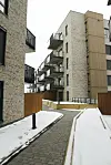 Fasadene er variert med nøye utvalgte tegltyper, for å skape et spennende uttrykk og dele opp volumene. Inn mot gårdsrom og på balkonger er det valgt trepanel i varm tone, som gir et lunt inntrykk. Bebyggelsen har et stort utvalg utearealer både felles og privat, med markterrasser, balkonger og takterrasser.