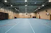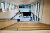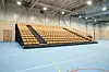 Inne i idrettshallen er det en tribune med 370 sitteplasser som kan kjøres ut fra veggen ved behov.