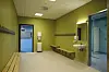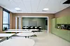 På vegger i klasserom og gangområder er malt robustgips et dominerende materiale.