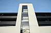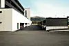 Fasaden har trekledning malt i mørk brunfarge, kombinert med eksponert betong malt i lys kontrastfarge.