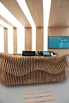Teglsteinen som er valgt i fasaden gir et spesielt spill sammen med de mange glassflatene og pregede aluminiumsprofilene i gyllen finish. Men materialfokuset fortsetter også på innsiden av bygget.