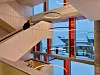 Hovedtrappen preger inngangspartiet. Bygget har i tillegg en interntrapp. Det gir en ekstra rømningsvei. Trappene er plassert i motsatt ende av hverandre. Grepet gir muligheten for å spare tid, for den som effektivt skal fra en etasje til en annen.