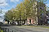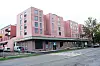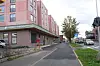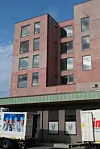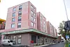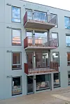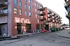 For å dempe inntrykket av det seks etasjer høye bygget mot hovedgata har arkitekten laget en vertikal inndeling med innhuk langs hele fasaden.