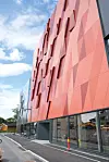 Fasaden deler de lange fasadene mot sør og nord i tre: barnehallen i vest, hoveddelen i midten og den høye tauhallen i øst. Et virkemiddel arkitektene brukte var å dele noen av platene diagonalt i to, og vinkle dem utover for å skape ujevnheter og gi inntrykk av en fjellvegg. Fargene er hentet fra inspirasjonsbilder av bratte fjellsider i ulikt vær og til ulike tider