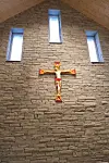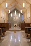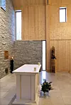 Betonggulvet er belagt med flis i kleberstein (Gascogne Blue), mens veggene og taket er kledd med granpanel. Gjennom et vindu med glassmaleri oppunder taket i vestenden kaster kveldssola fine farger på østfasaden med krusifikset og de tre vinduene som er tradisjonelle i cisterciensernes arkitektur.