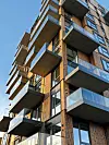 Alle de 53 leilighetene har utkragede balkonger, plassert ulikt og i forskjellige størrelser, fra etasje til etasje.