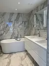 – I Tårn 12 har vi lagt ekstra kvaliteter og derfor ligger prisene noe høyere, sier Haugli, og nevner: skifergulv i gangareal-ene i første, teppeflis i korridorene oppover i etasjene, sittenisjer i vinduskarmen, Norac badekabiner, hvitlakkert énstavs eikeparkett i alle leiligheter og postkasser i inngangspartiet som kan åpnes med mobiltelefon.