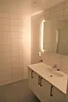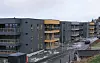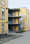 – Materialer og fargepalett tar utgangspunkt i omkringliggende omgivelser. Den gule representerer kornåkerne, de blågrå fargene speiler havet og sjøen. Nyanser av gult og grått er brukt om hverandre både utvendig og innvendig i felles trapperom.