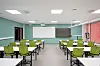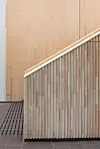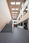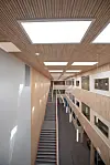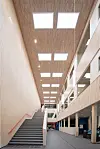 – En romslig hovedtrapp forbinder alle etasjer i nybygget med nordfløyen (eksisterende bygg). Trappen er en massiv trekonstruksjon, og trapperommet kobler nybygg og eksisterende bygg. I plan 3 og 4 i sentralbygget finnes undervisningsrom, lærerarbeidsplasser og realfagrom. I plan 1 finnes undervisningsrom, garderober, felles treningsrom og fellesareal. Her er også hovedtyngden av tekniske rom, sier Aase.