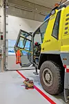 Hovedinngangen ligger på brannstasjonens sørside. Siden stasjonen ligger inne på flysiden må besøk godkjennes.