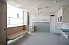 Hovedinngangen ligger i en tangent på byggets oppside med inngang til plan 1. Ambulanseinngang ligger i underetasje. Bygget har ni store heiser. Hele bygget har universell utforming. Det er lydabsorberende plater i himlinger og bak sengegavler.
