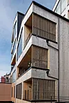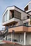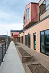– Terrassevolumene har samme kledning, men variasjon i farge oppover i høyden. Terrassene har store plantefelt som skaper et grønt terrassert landskap. Småhusene har en variasjon av tre ulike fasadekledninger, og er helkledd i sitt respektive materiale, slik at de står i kontrast til terrassevolumet. Store glassflater skaper luftighet og god romfølelse i kombinasjon med et moderne urbant uttrykk. Disse glassflatene er skjermet med spilevegger og grønne buffere mellom vinduer og felles passasjer. Hovedinngangen er inspirert av tradisjonell byggeskikk, og er utformet slik at det ser ut som den kommer ut av terrenget, med en stor glassfasade som lyser inviterende inn, utdyper Vindenes.