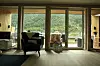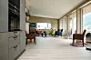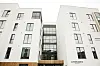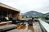 Utvendig fasade gir bygget et eksklusivt preg med lys Weber fasadepuss i kombinasjon med lys brun termofuru fra Moelven og glassfasade fra Holvik Glas.