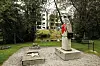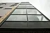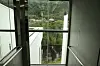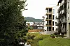 Trapperommet med heis er av glass og letter fasaden mot veien og gir utsikt til elva fra heisen. Hagen er opparbeidet med flere mindre sosiale soner, trapp og rampe ned mot elva.