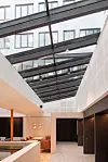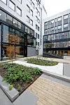 Inne i bygget er det to gårdsrom, det ene har en hage.