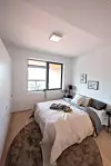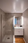 Det er parkett på gulv og flislagte, plassbygde baderom. Innervegger er av gips og stålstender. Himlinger er av betong eller nedsenket gips. Et teknisk rom ligger i kjelleren, et i sjuende etasje.