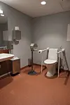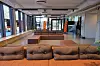 elevene. På gulvet er det store flater med teppeflis, og i tak og vegger er det