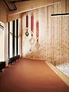 rom med en lysåpning i taket. Overlyset og kryssende bjelker i taket kan minne