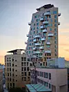 Bygget består av to tårn, og de er støpt separat på grunn av høyden og bevegelse til bygget. Men byggene henger sammen i noen etasjer, og her er de støpt sammen. Litt av særegenheten til bygget kommer fra fasaden, som ikke bare er rett. Og det er en klar tanke bak designet.