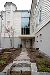 – I bygget er det også tatt valg i utforming og materialer som understreker skille mellom det gamle bygget og tilbygget. Her er det brukt bærekraftige materialer i eksempelvis kubbegulv. I kjelleren er tømmervegger fra riving av det gamle trapperommet, brukt som veggkledning. Gamle dører funnet i kjelleren er gjenbrukt som skyvedører til lagerrommene, sier Kahrs.
