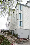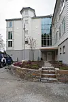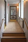 Ny hovedtrapp og heis for gjester kunne ikke løses uten å rive en del av bygget og erstatte denne med et nytt, litt større tilbygg. Form og fasader i det som tidligere var et trappehus er nå gjentatt i nytt heishus. Men her er også tilført nye elementer som eksempelvis glassfasader, vintårn mellom etasjer over hovedinngang og spilevegger av messing mot ny hovedtrapp. Dekor i spileveggene har elementer fra arkitekt Schous detaljer i dører med glass. Detaljene har også inspirert til Fløirestaurantens logo.