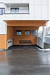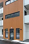 Fasadene har hvit og svart Cembrit Solid platekledning og stående guloransje trekledning.
