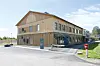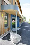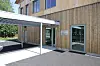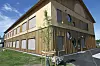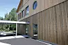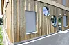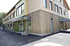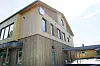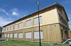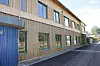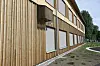 Skolen har fått en fasade som er dekket med malmfuru, med