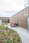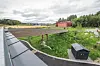 Bygget har solcellepaneler på takene, samt på flere av