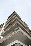 satt opp i betong, og fasaden er hovedsakelig bindingsverk med tegl, puss,