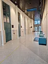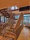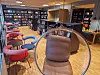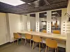 veggene i publikumsområdene er mye paneler av eikefiner. Til himling er det i