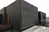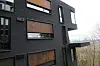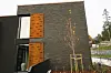 har 50 prosent mørk teglstein i front, og 50 prosent mørk panel med innslag av