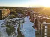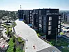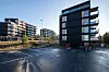 bygningsmiljøet, og for å senke høyden mot skog og veier. Leilighetene er