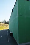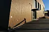massivtre og trekledning med variasjoner og fargede felt, samt glassfasader og