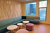 pulttak og trekledning i naturlige toner, supplert med kontrastfelt med