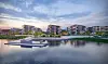 brygge ved det store vannspeilet, fontenene og rekreasjonsområder.