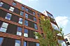 har seks etasjer. Fasadene har beklednings-tegl i ulike farger, og på takene og