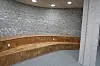 et stort amfi med sitteplasser til alle skolens elever. Benkene i amfiet er
