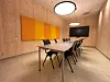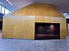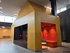 MDF-plater av hensyn til akustikken. Mye av inventaret er plassbygd. Overgangen